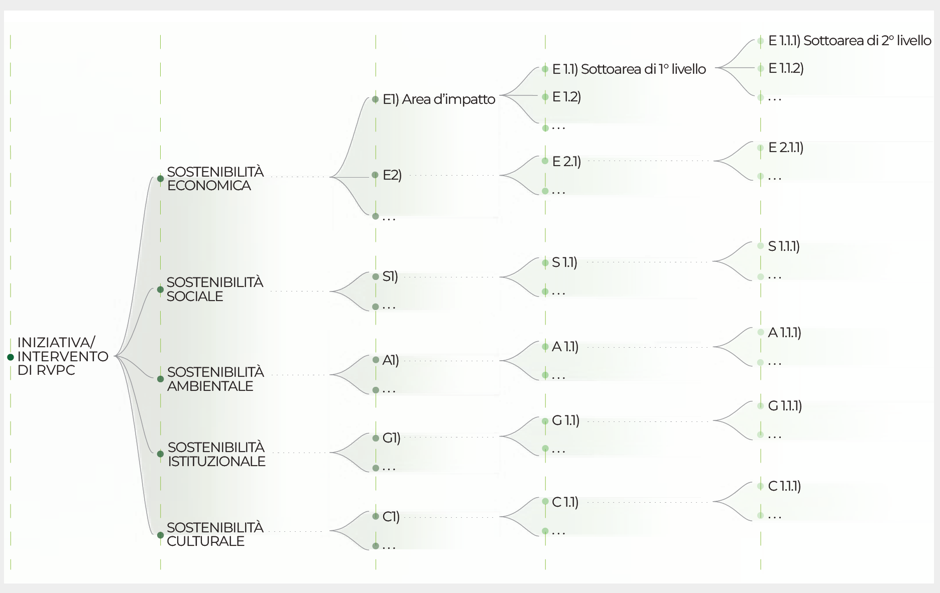 Una mappa degli effetti di un’iniziativa RVPC ricostruisce i suoi impatti (attesi o generati), considerando le diverse dimensioni della sostenibilità: sociale, ambientale, economica, culturale, istituzionale, ecc. All’interno di ciascuna dimensione della sostenibilità, è poi opportuno individuare delle aree di impatto generali, a loro volta composte da una o più sotto-aree. Le aree di impatto hanno lo scopo di raggruppare categorie di effetti simili che devono essere analizzati durante la valutazione. Nella definizione delle aree di impatto è utile anche identificare l’ordine di causalità dei diversi impatti/effetti (vedi “Aspetti metodologici”).