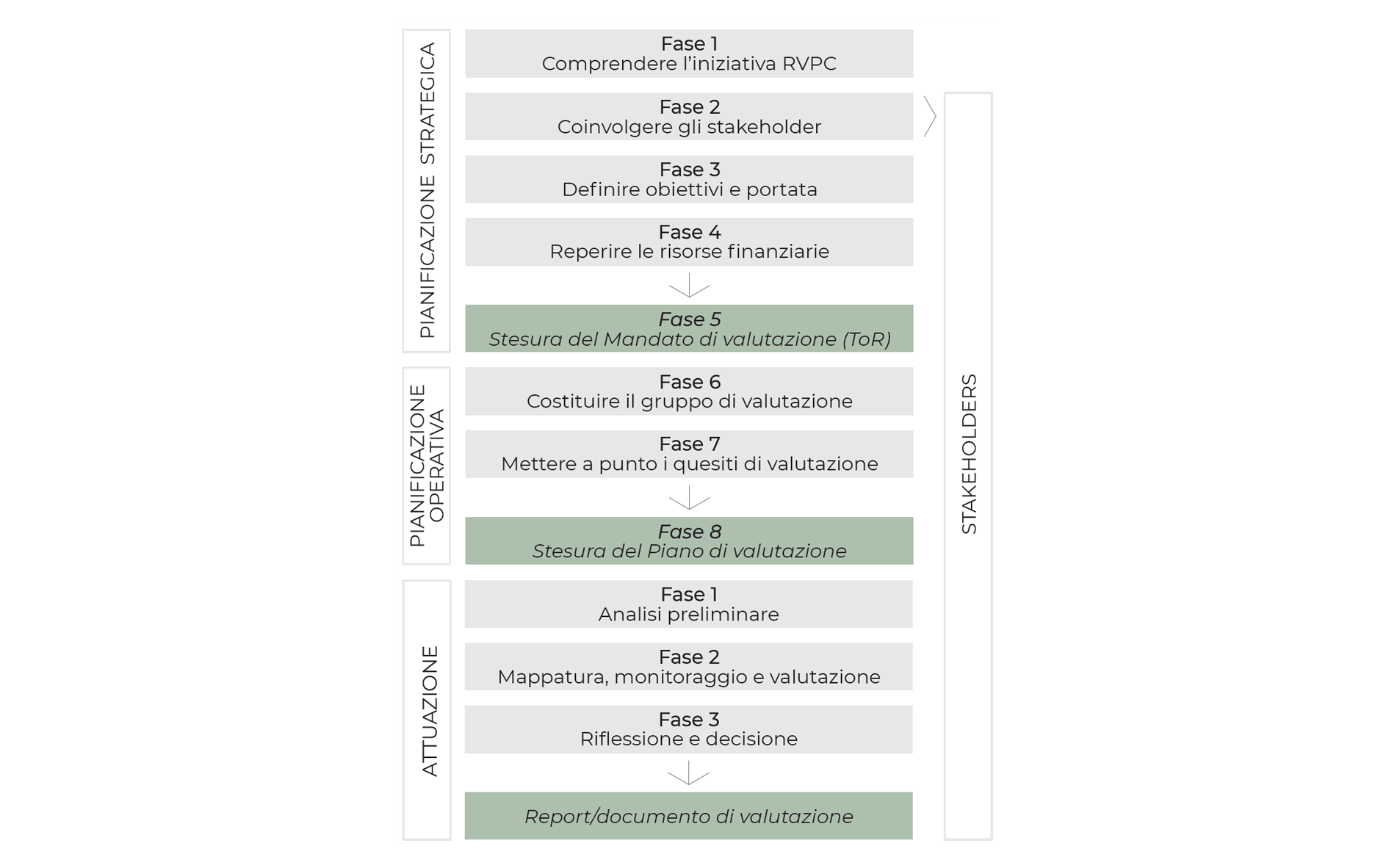 La valutazione di iniziative RVPC non è un’attività improvvisata, bensì un processo che richiede lo svolgimento di un insieme articolato e interconnesso di attività suddivise in tre principali macro-fasi [Fig. 6]: Pianificazione strategica, Pianificazione operativa, e Attuazione.