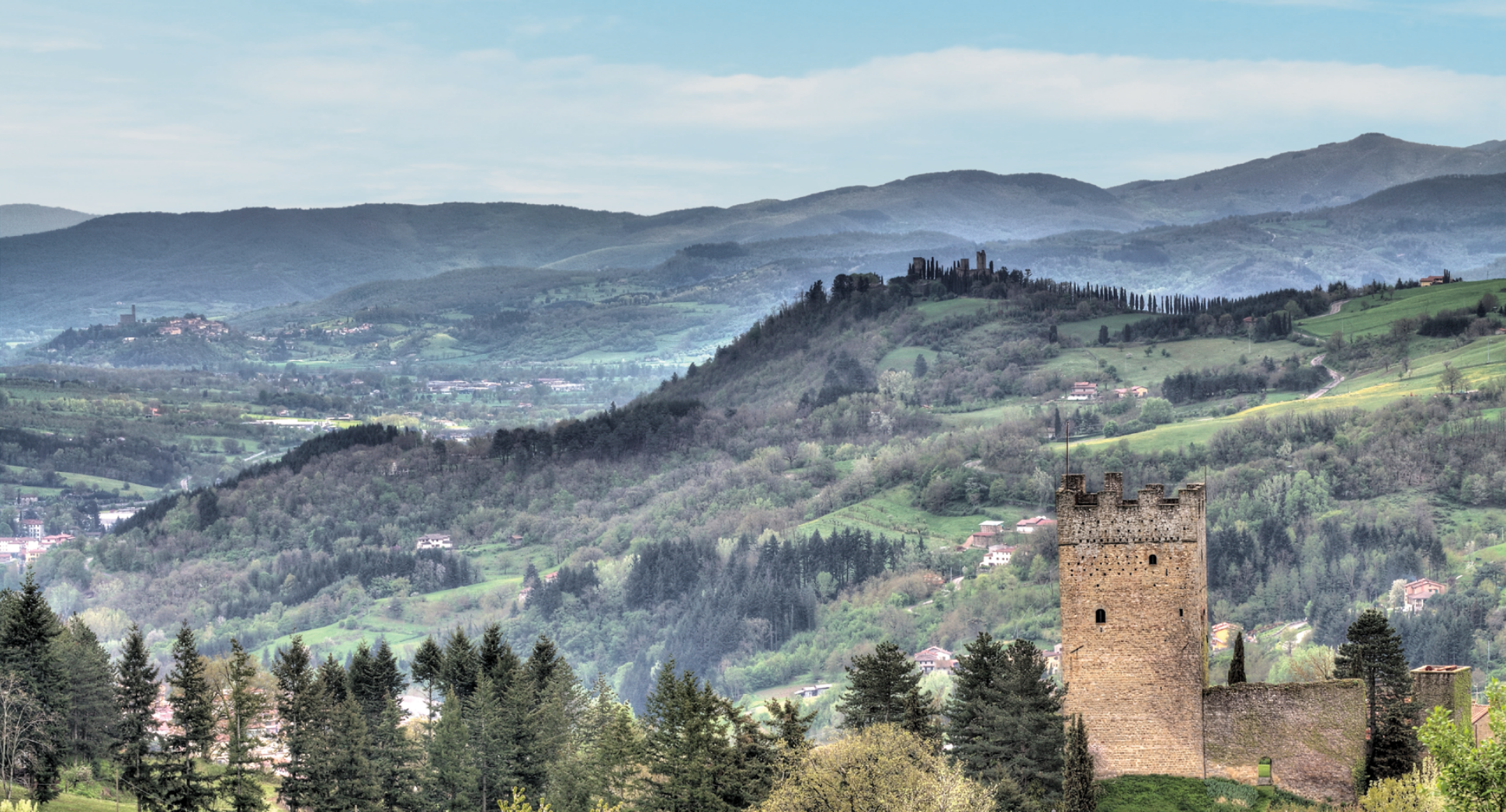 Veduta della prima valle dell’Arno con i tre castelli di Porciano, Romena e Poppi ai piedi dei quali si sono sviluppati gli insediamenti di Stia, Pratovecchio e Ponte a Poppi. (Foto di Davide Quizze Cerini)