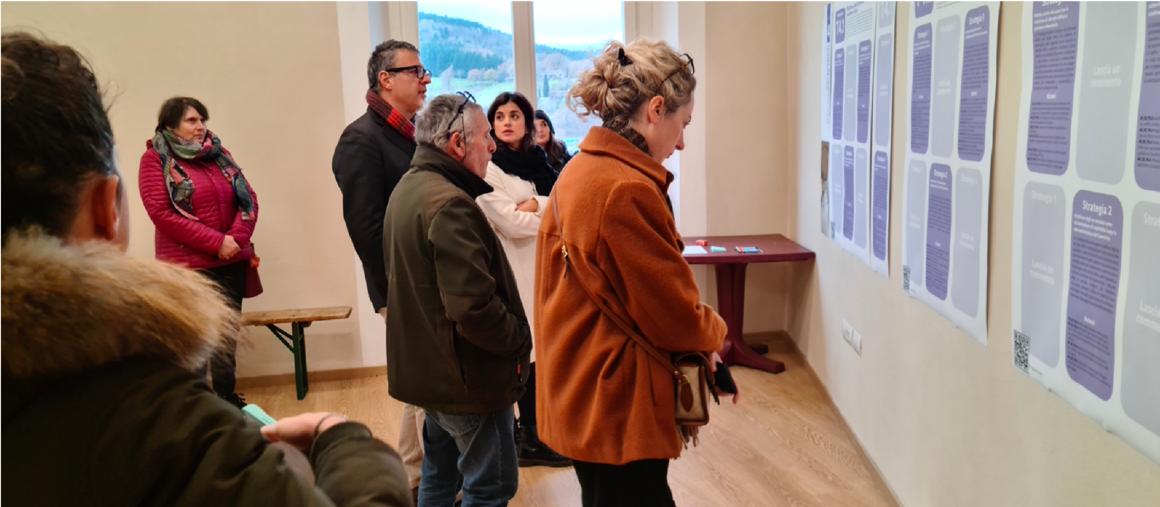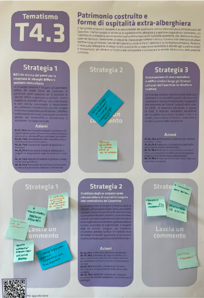 Fig. 2.0.8 – Commenti dei partecipanti relativi al Tematismo T4.3. (si noti, in basso a sinistra, il codice QR grazie al quale è stato possibile acquisire, da parte degli abitanti, ulteriori suggerimenti sulle Strategie proposte. (Archivio REACT)
