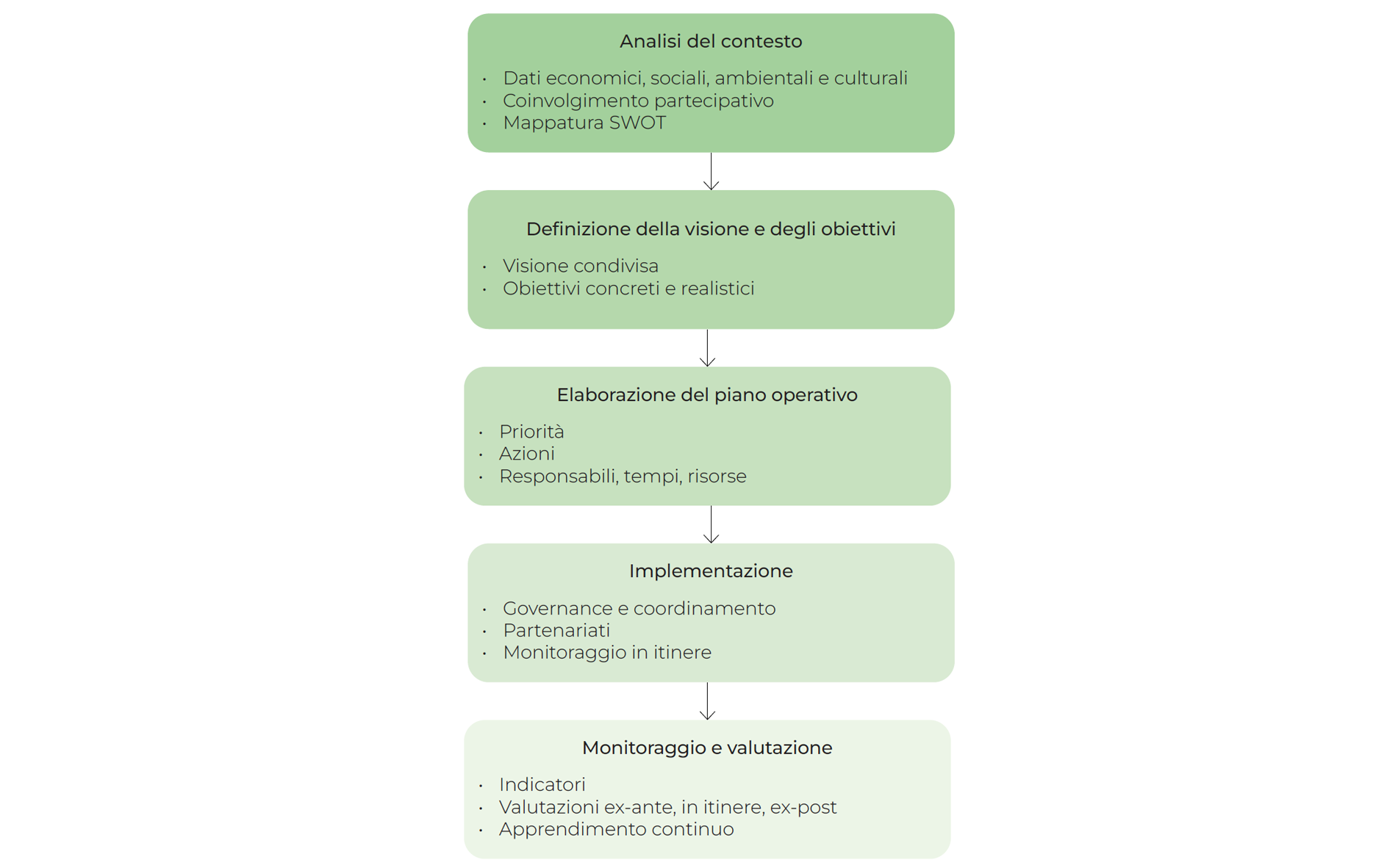 La costruzione di una strategia di sviluppo territoriale efficace richiede un percorso articolato, suddiviso in fasi interconnesse, capaci di assicurare coerenza, partecipazione e risultati concreti [Fig. 2].